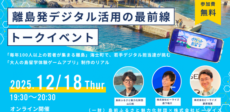 本イベントは、島根県・海士町と株式会社ビーライズにて共同制作した隠岐島前地域での暮らしや学びを疑似体験できるゲームアプリ「ポケット島留学」の取り組みを題材とした、地域の課題がどのようにデジタル技術で解決され、どのように技術的に実装したのかを対談形式で紹介・解説するオンラインイベントです。