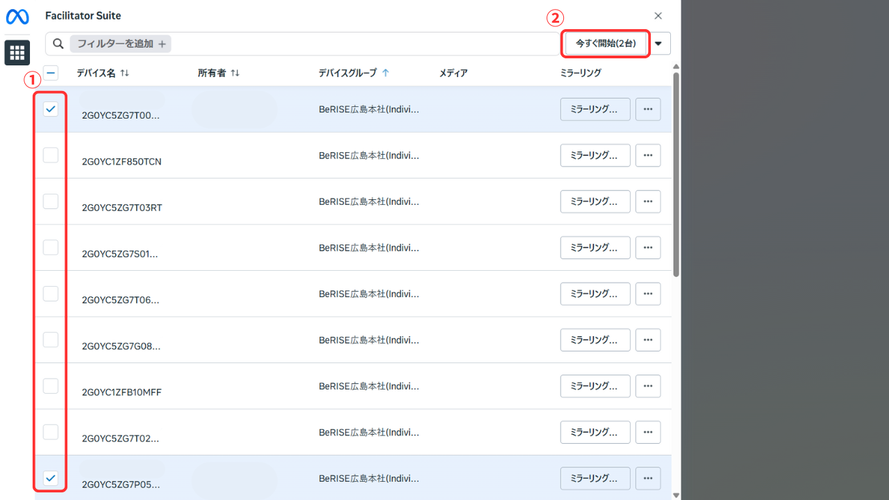 - ミラーリングしたいデバイスにチェックを入れ、[ミラーリング…]ボタンをクリックします。