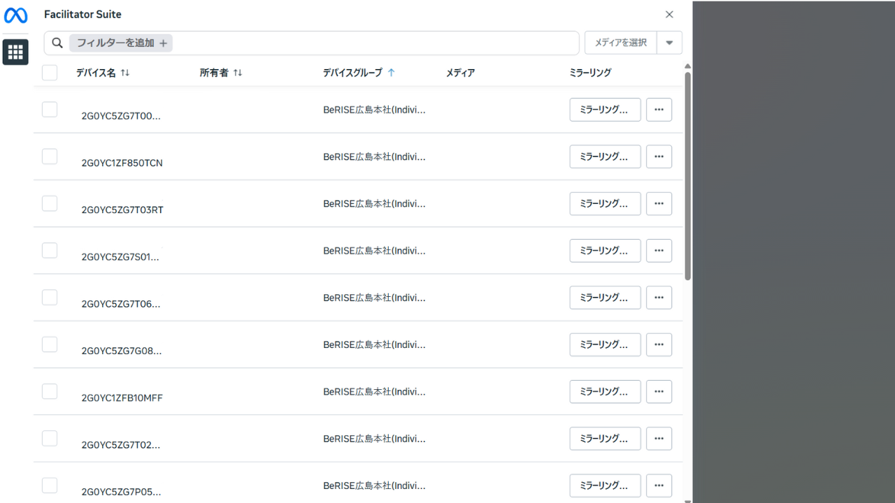 PC側の「Facilitator Suite」の画面内に、選択したデバイスのミラーリング映像が表示されます。複数選択した場合は、画面が分割されて同時に表示されます。
