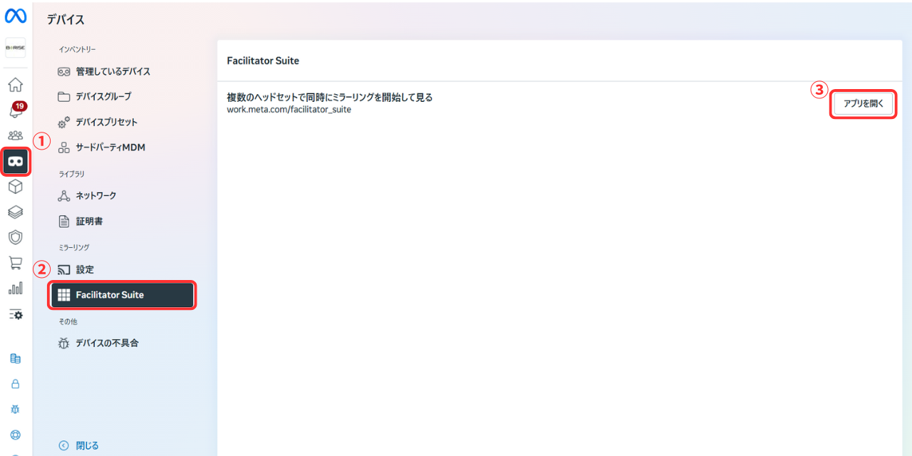 - 管理用PCでHMS管理センターにアクセスしてログインし、[デバイス]タブから[Facilitator Suite]を選択し、[アプリを開く]をクリックします。