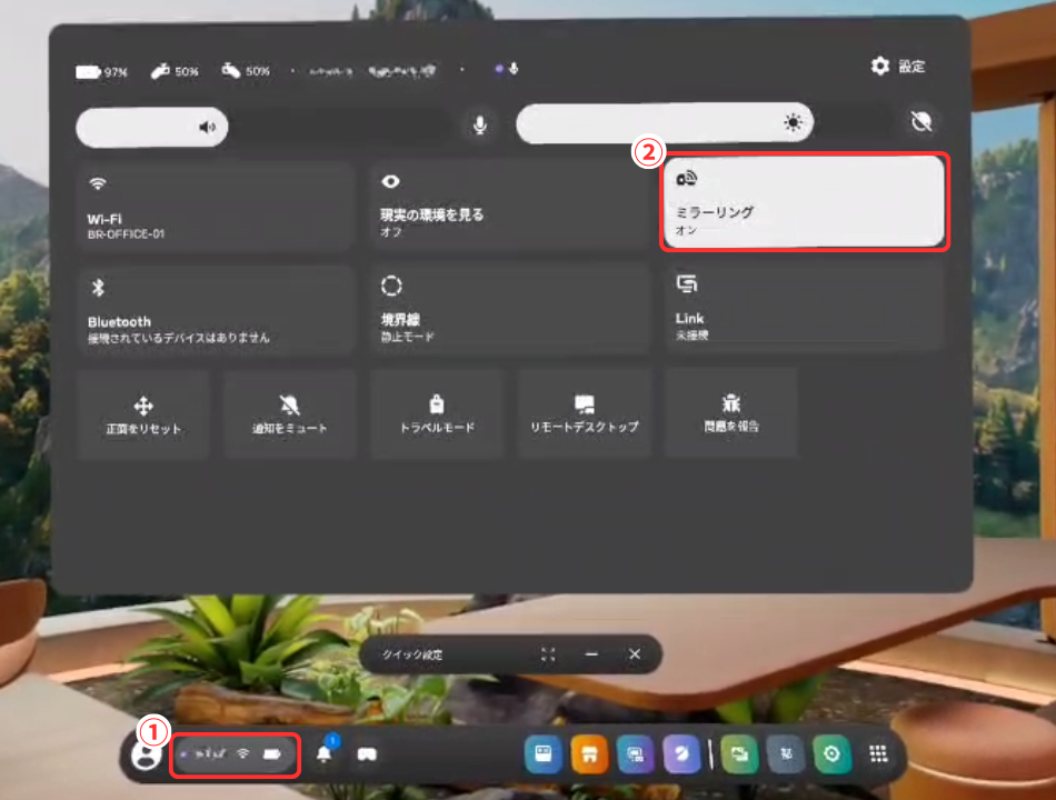 - Questデバイスの「クイック設定」パネルを開き、「ミラーリング」を選択します。
