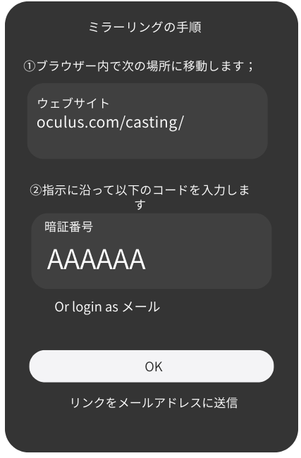 - PCのブラウザで、ミラーリング先のウェブサイトURLにアクセスします。 (oculus.com/casting/〇〇 )