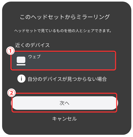 次に、Questデバイス側を操作してPCブラウザにミラーリングする手順です。