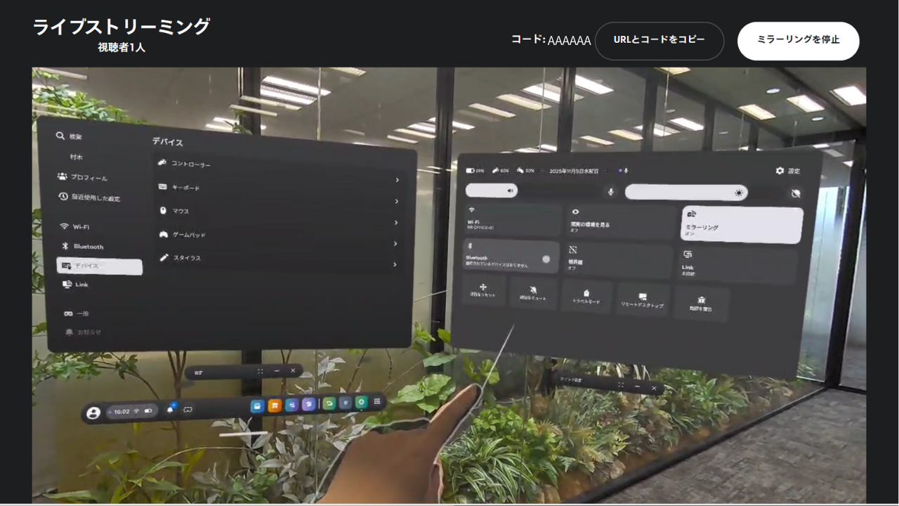 - 接続が確立され、PCブラウザにQuestの映像がミラーリングされます。