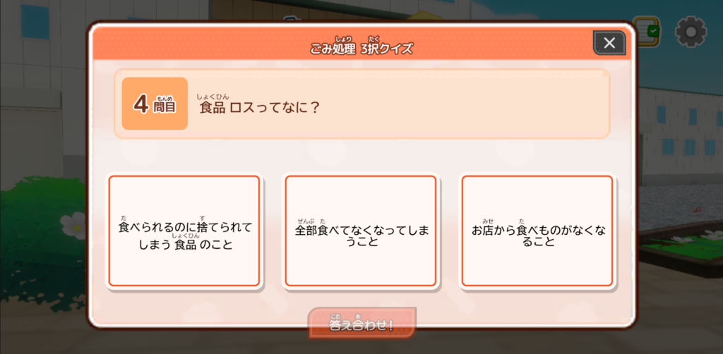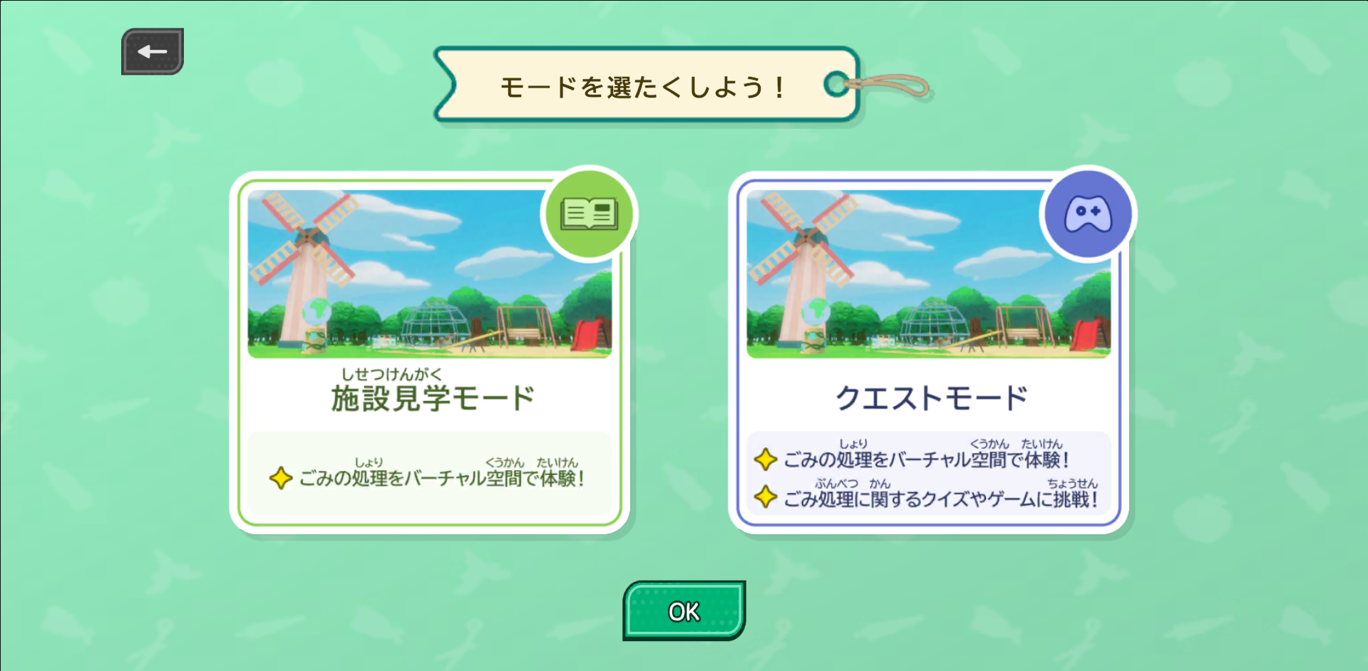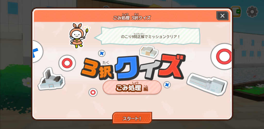 クエストモードでは、クイズやゲームをしながらごみの処理について知ることができます。