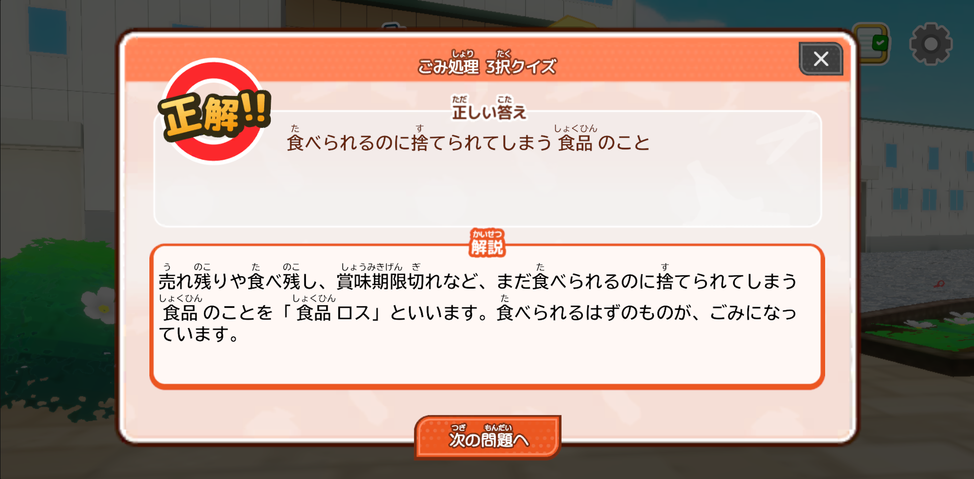 クエストモードでは、クイズやゲームをしながらごみの処理について知ることができます。