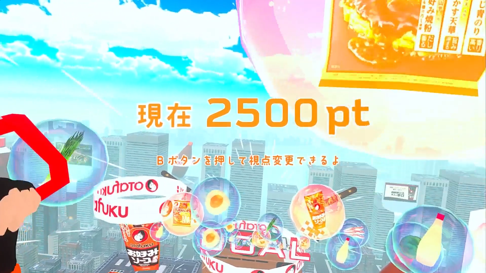 お好み焼のパラシュートで飛びながらテッパンシティに浮かぶ具材をゲットし、最後にお好み焼をひっくり返して完成させると、